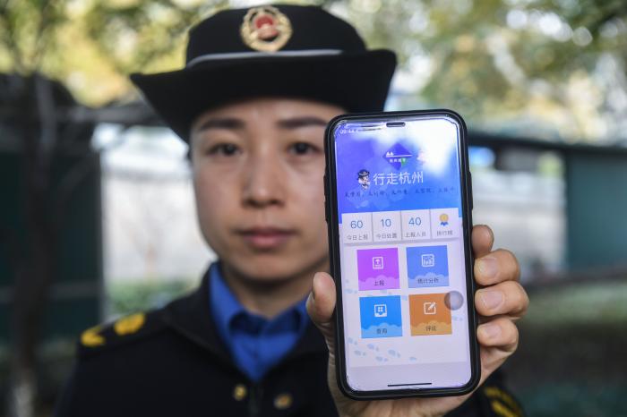 城管执法人员展示与数字化管理平台相连的手机APP。