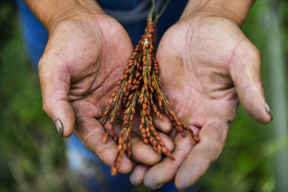 2020年8月13日,在吉林市孤店子镇春新农场,农民观察试种的彩色稻米生长情况。新华社记者 许畅 摄