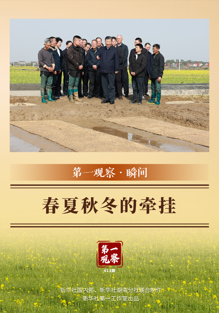 仲春时节,习近平总书记来到常德市鼎城区谢家铺镇粮食生产万亩综合示范片区,走进水稻田边,察看秧苗培育和土地翻耕情况,并同种粮大户、农技人员、基层干部和村民亲切交流。