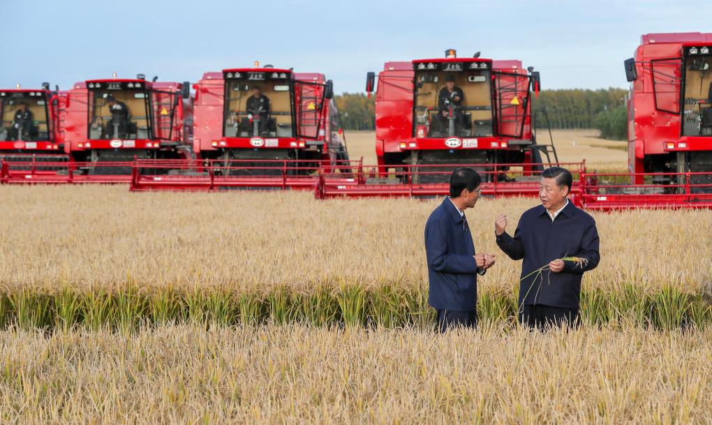 2018年9月25日,金秋时节,稻浪滚滚,黑龙江农垦建三江管理局七星农场万亩大地号丰收在望。习近平总书记走进正在收割的地块,拿着稻穗,同工作人员交谈,详细了解粮食生产和收获情况。