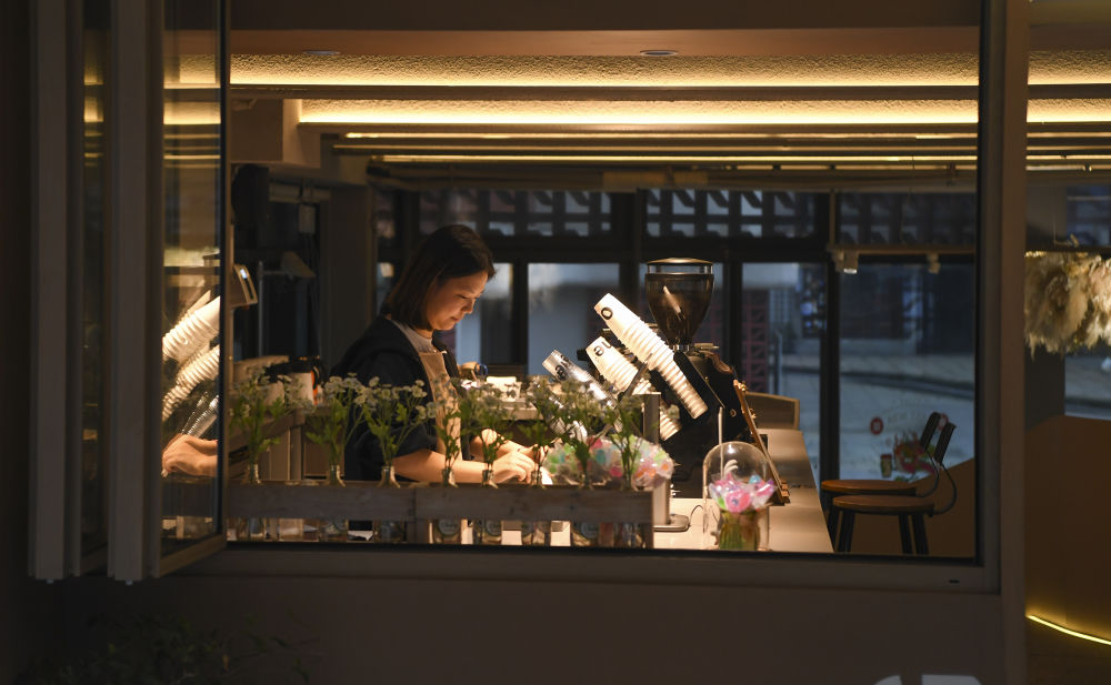 2024年4月22日,在重庆市九龙坡区谢家湾街道民主村社区,饮品店工作人员在店内忙碌。