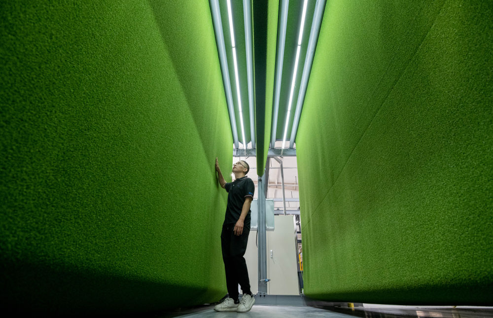 在山东省乐陵市泰山体育产业集团人造草坪智能化生产车间,工人在检测产品。新华社记者 范长国 摄很多人恐怕想不到,这家常年为奥运会、亚运会、单项世锦赛服务的国际赛事“标配”供应商,40多年前还只是一个校用定制小作坊。看着飞速运转的自动化生产线,说起当年从三米房顶赤脚跳下测试训练用垫子质量的往事,集团董事局主席卞志良感慨,“中国制造”筚路蓝缕、拔节生长,是体育强国建设的生动注脚。